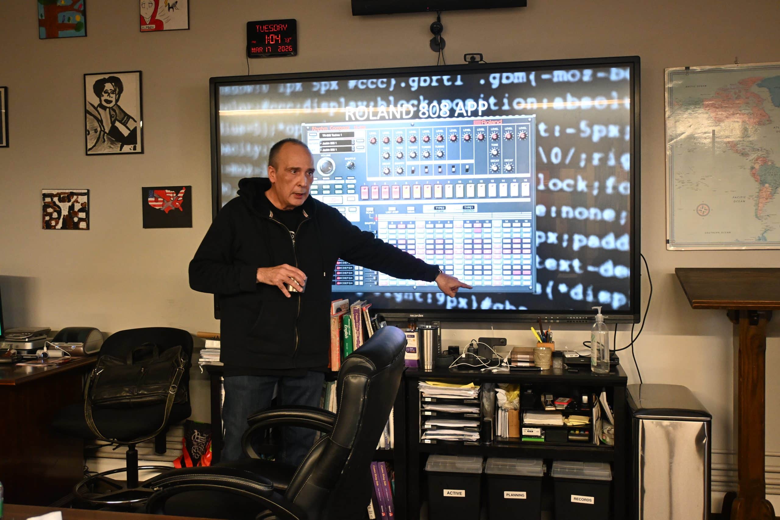 The students were making beats in a special workshop with musician George Hagegeorge. The session started with a lesson that walked through thee history of automated percussion tracing back to the 13th century. Today, these beat machines have become a standard in music production.