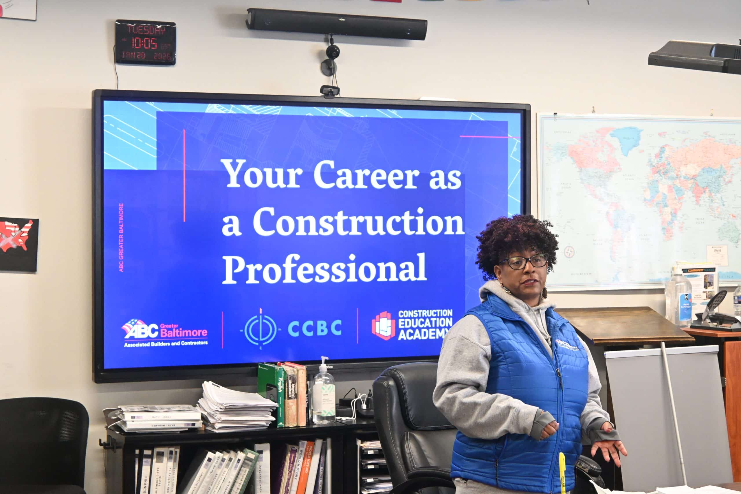 Sharon Burley, Assistant Manager of Workforce Development at the Associated Builders and Contractors of Greater Baltimore came in to talk with the students today. Ms. Burley spoke about the training and apprenticeship opportunities at ABC. Students in the school are interested in a wide variety of career choices from being an astrophysicist to a marine biologist, from nursing to the trades. This presentation and conversation highlighted a very important opportunity that several students are interested in pursuing.